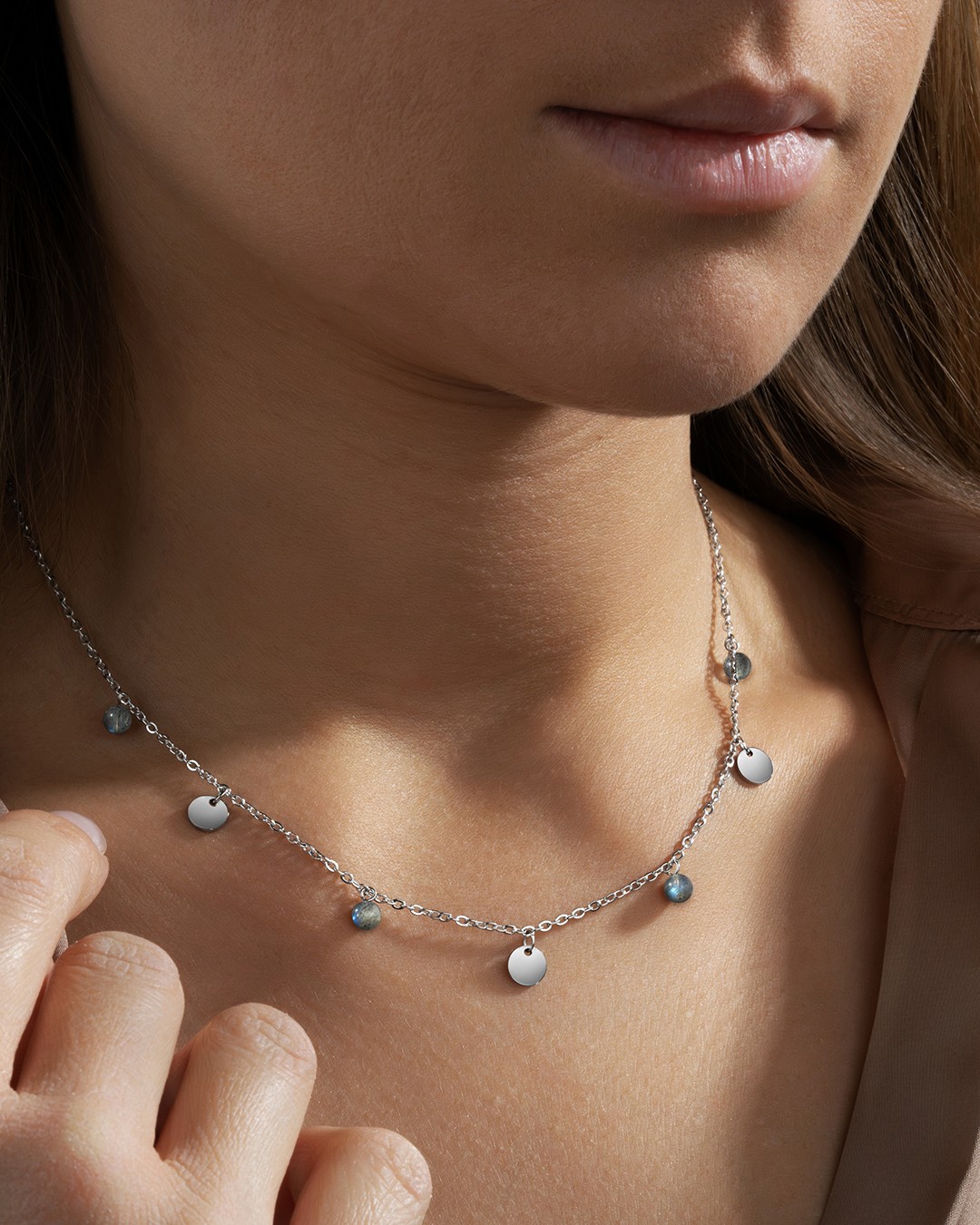 Mesurant 48 cm de longueur avec une partie ajustable de 6,5 cm, ce collier est conçu pour s'adapter facilement à votre tour de cou.