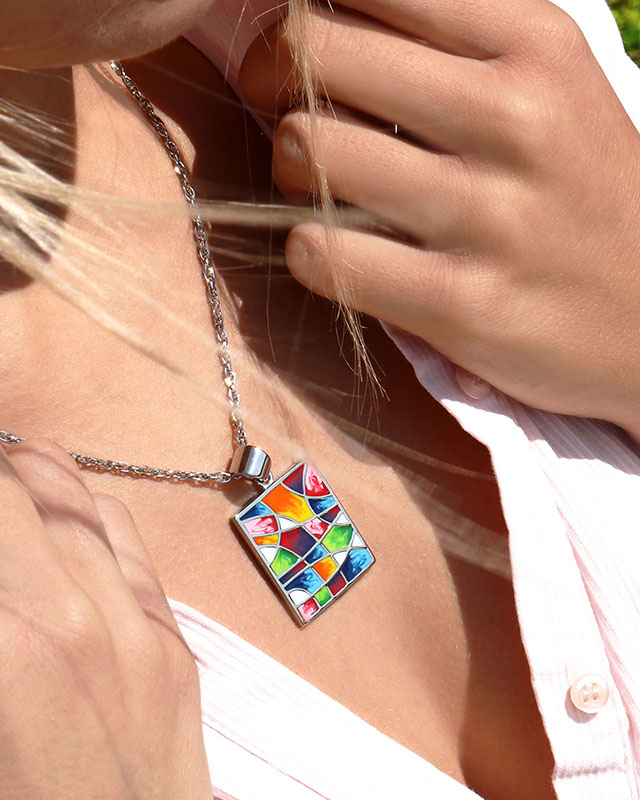 Ce bijou en acier émaillé est riche en couleurs et en mosaïques représentant la nature exceptionnelle dans laquelle baigne Rivalta, connue pour ses nombreuses espèces végétales. Vous pouvez l'associer avec notre bracelet Rivalta qui reprend les mêmes mosaïques multicolores, pour ajouter une touche discrète et originale à votre look.