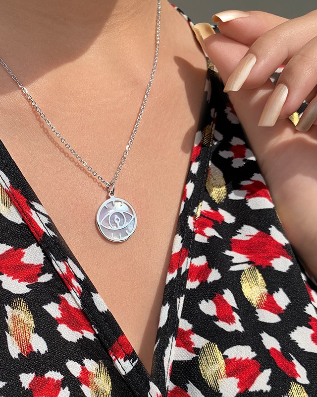 Ce collier représente l'oeil de protection. Il est le symbole de la protection, mais il est aussi un porte-bonheur. En Amérique du Nord et en Europe, l'oeil de protection symbolise la confiance, le pouvoir ainsi que la sécurité.