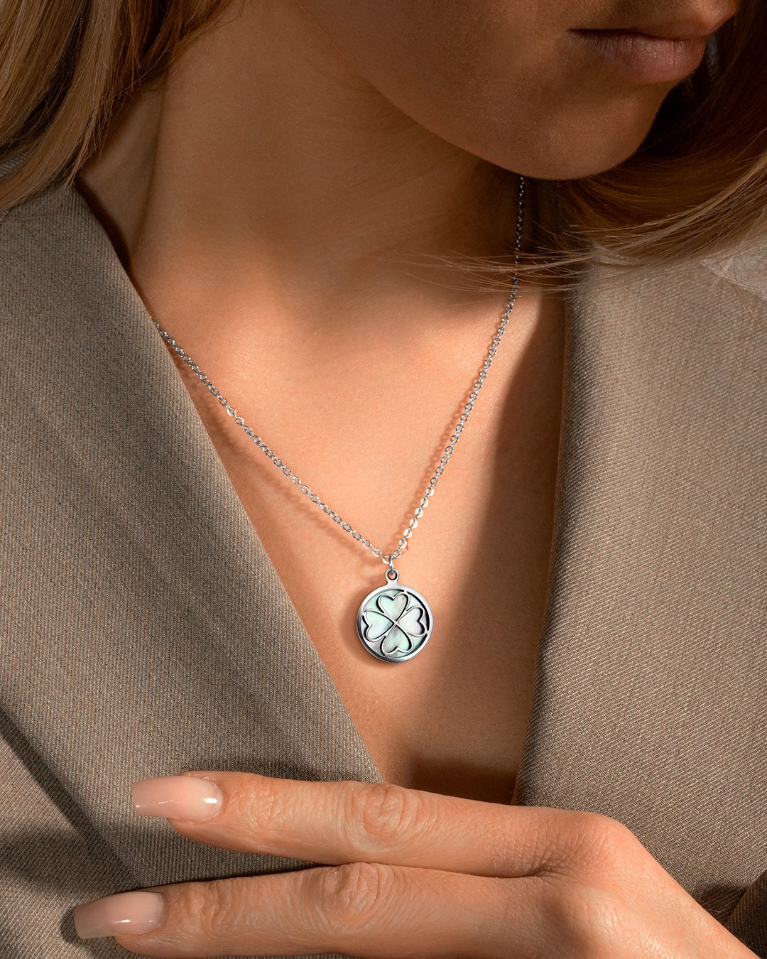 La nacre de son médaillon s'illuminera aux reflets du soleil ce qui donnera au bijou un effet scintillant.